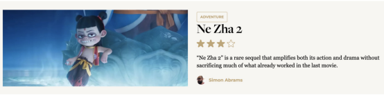 比如,由以已故著名影评人罗杰·艾伯特(RogerEbert)命名的资深影评媒体“罗杰·艾伯特”网站给予了《哪吒2》三星的评价(满分为四星),并称其“在不牺牲前作成功元素的前提下,进一步提升了动作场面和戏剧张力。”作为对比,同期在海外上映的《美国队长4》评分为一星。