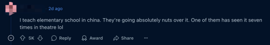 在一条讨论《哪吒2》登顶世界动画电影影史票房榜单的帖子下,一位自称在中国当外教的网友提道,“他们完全是狂热的状态,有个学生都看了7次了。”